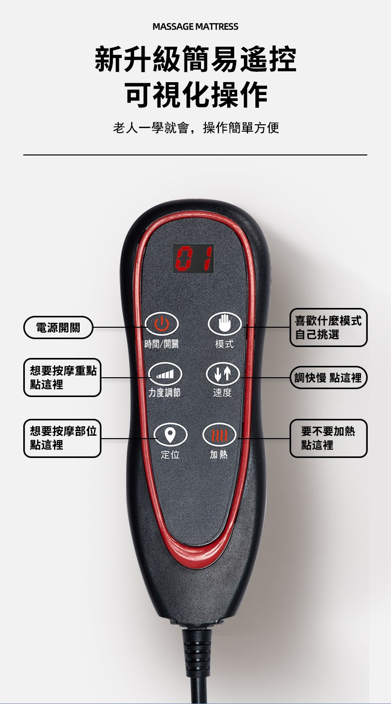 11分鐘前多功能全身按摩床墊 | 電動加熱頸椎、腰部、背部、腿部全方位按摩器,舒緩身心疲勞 - 6鍵旗艦款(6鍵揉捏+震動+氣囊+10電機+腰部熱敷)