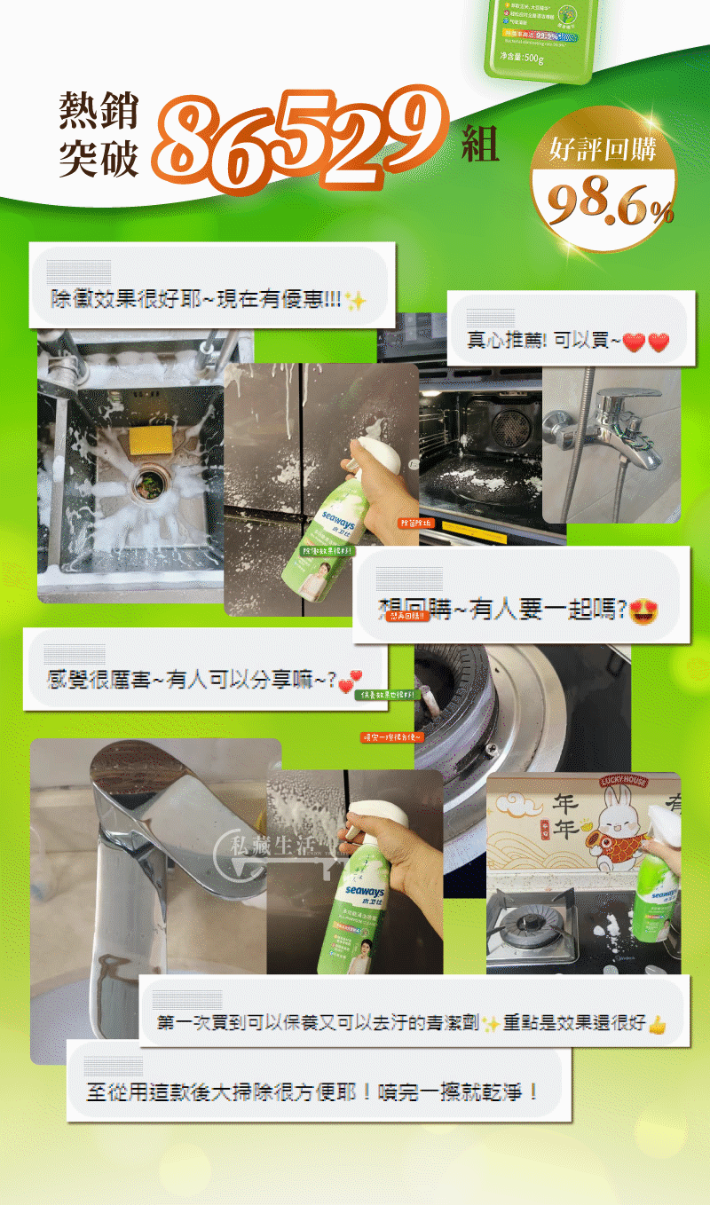 7分鐘前全屋煥然一新日本瘋搶除垢劑【Seaways極效潔垢劑】極效去汙X乾淨透亮 - 極效潔垢劑【6入】再享免運!